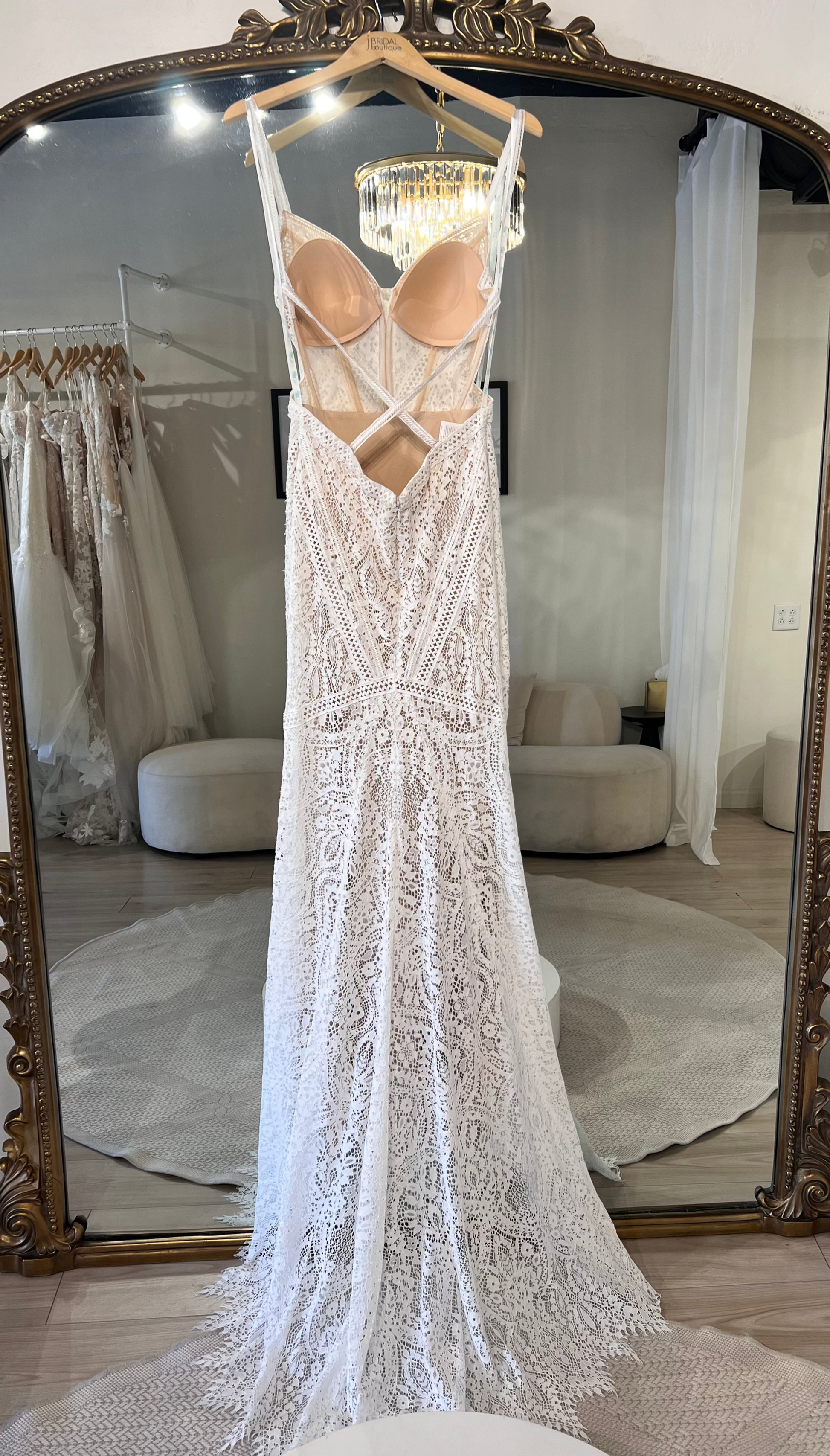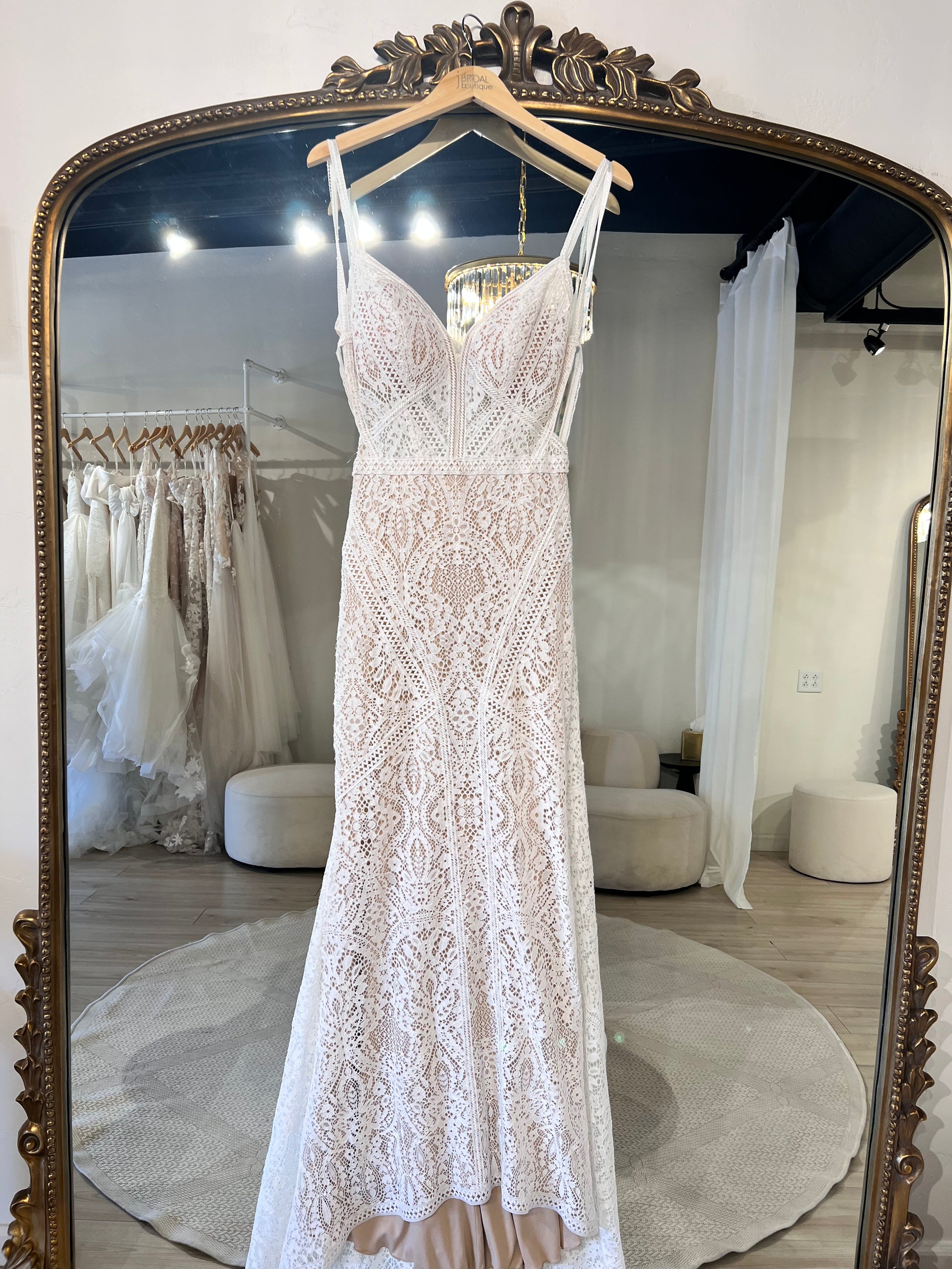 This gorgeous, boho laced fit-n-flare gown contains a unique open back with cross detail that accentuates the back, highlighting your figure. The unique corded Chantilly lace covers the gown and cascades into a delicate lace trim train.