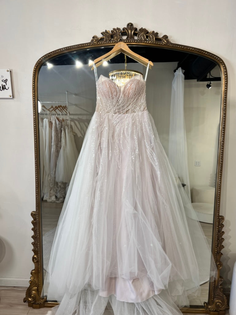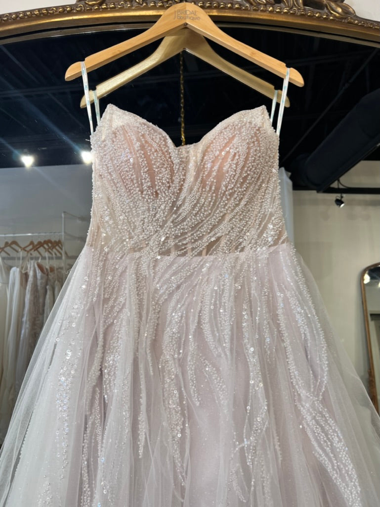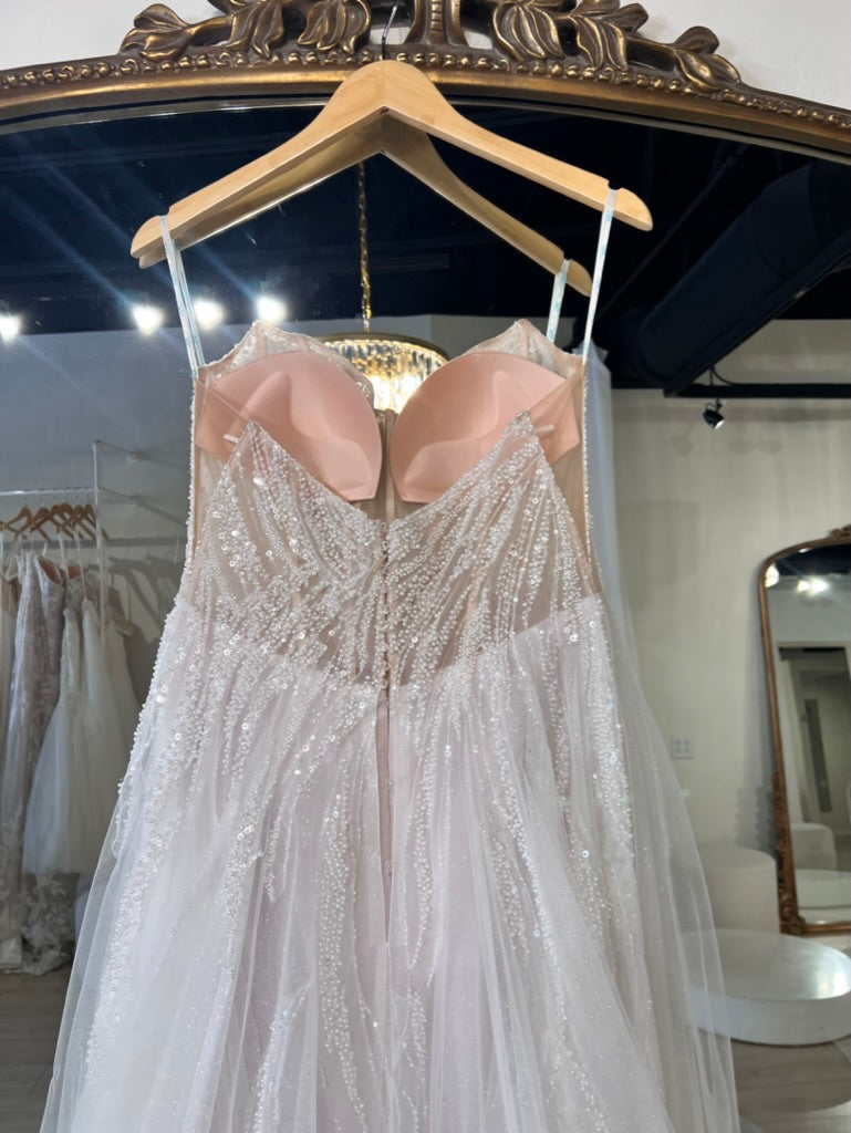 Extravagant A-line beauty adorned in flowing beading with a scoop neckline, illusion side cut-outs, and a flirty peek-a-boo slit with a glitter tulle layer. Cascading beaded overlay glistens with the soft tulle skirt, catching eyes in all areas. Detachable off-shoulder straps are not included.