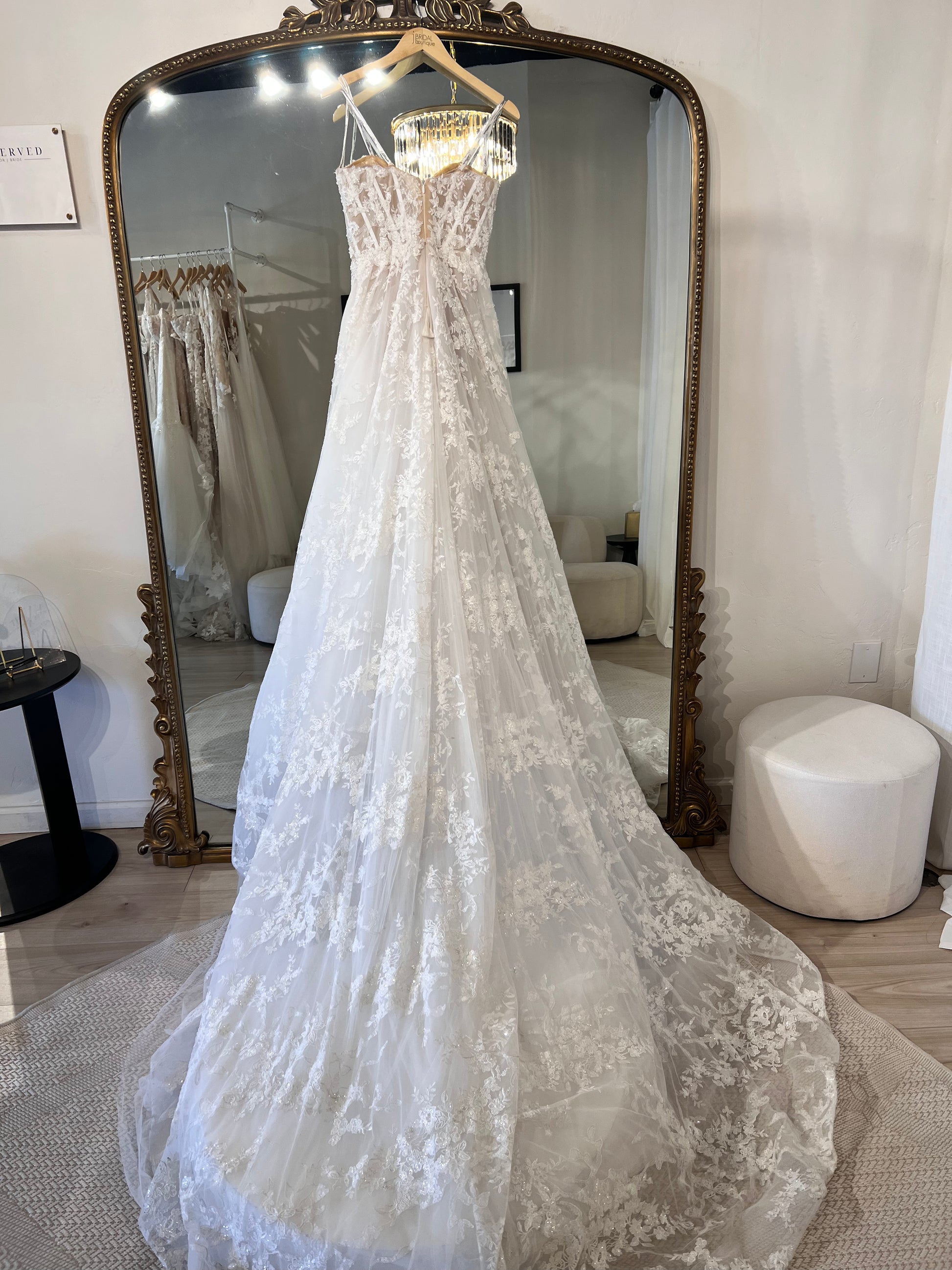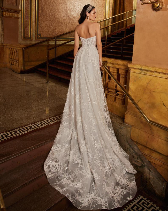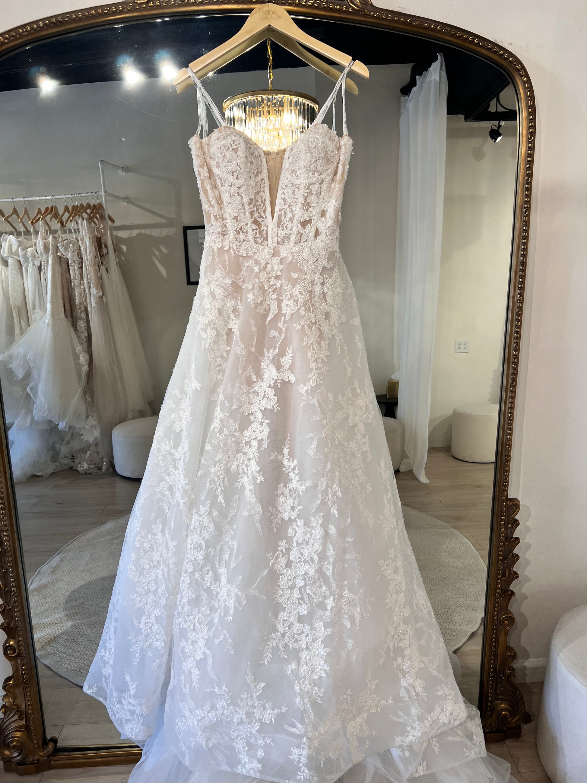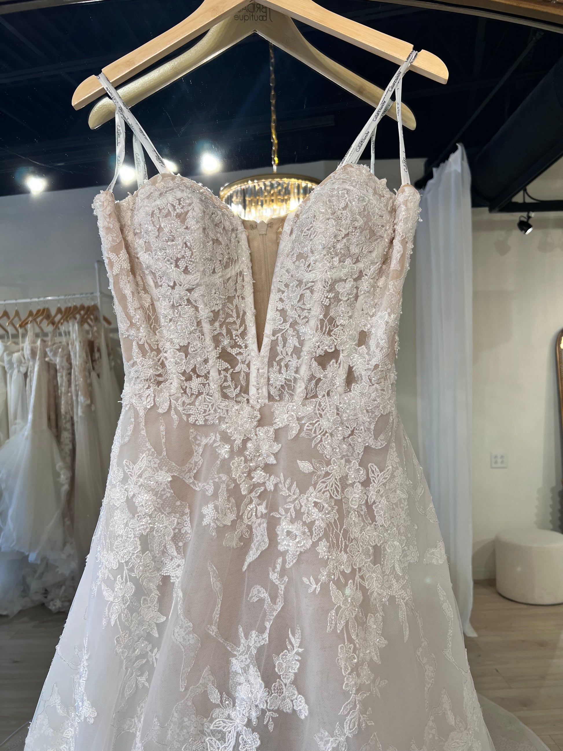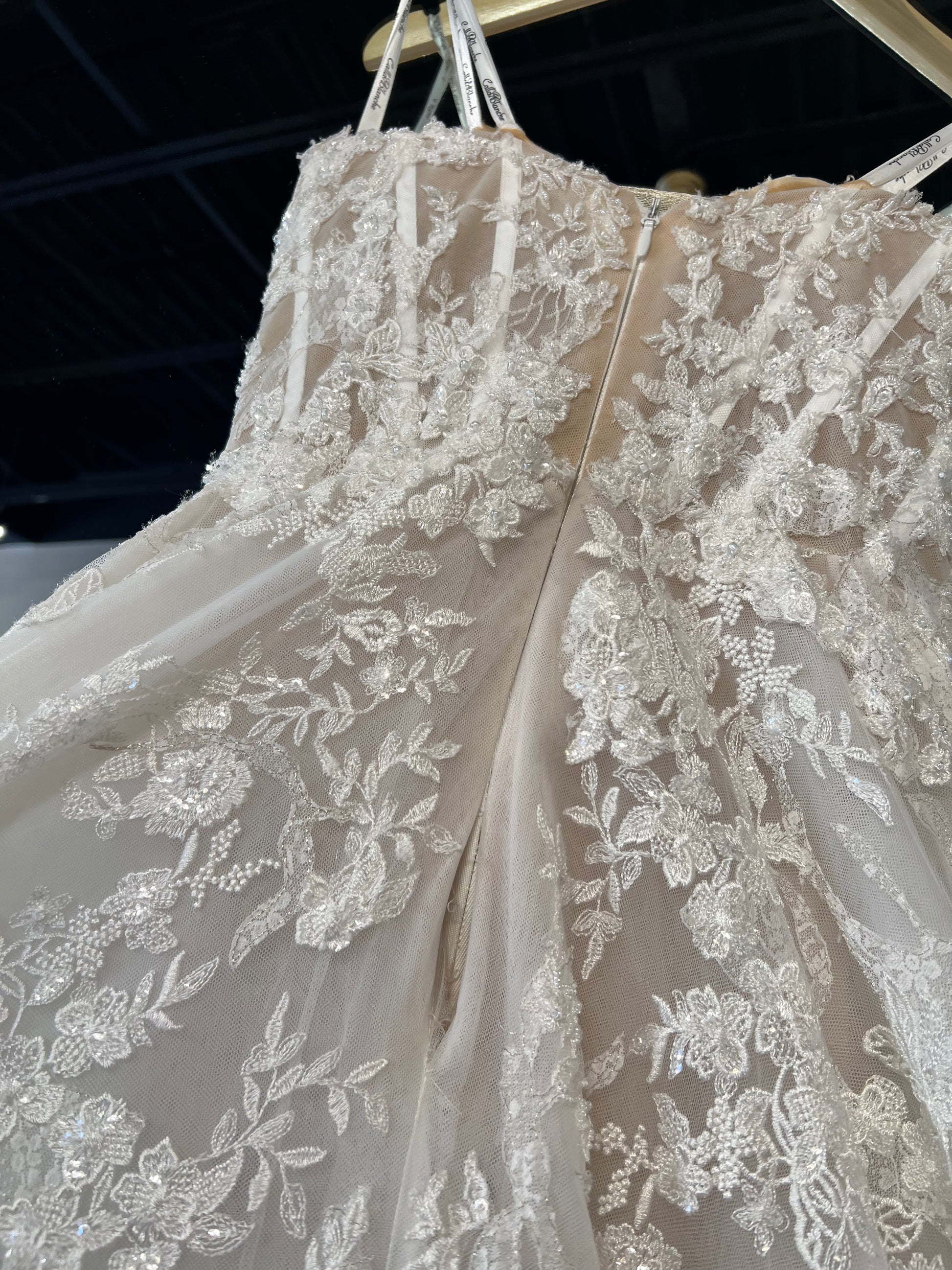 This beautiful laced A-line features a corset style bodice that helps to contour your torso, with sparkling sequin and beaded details, and a sweetheart neckline.