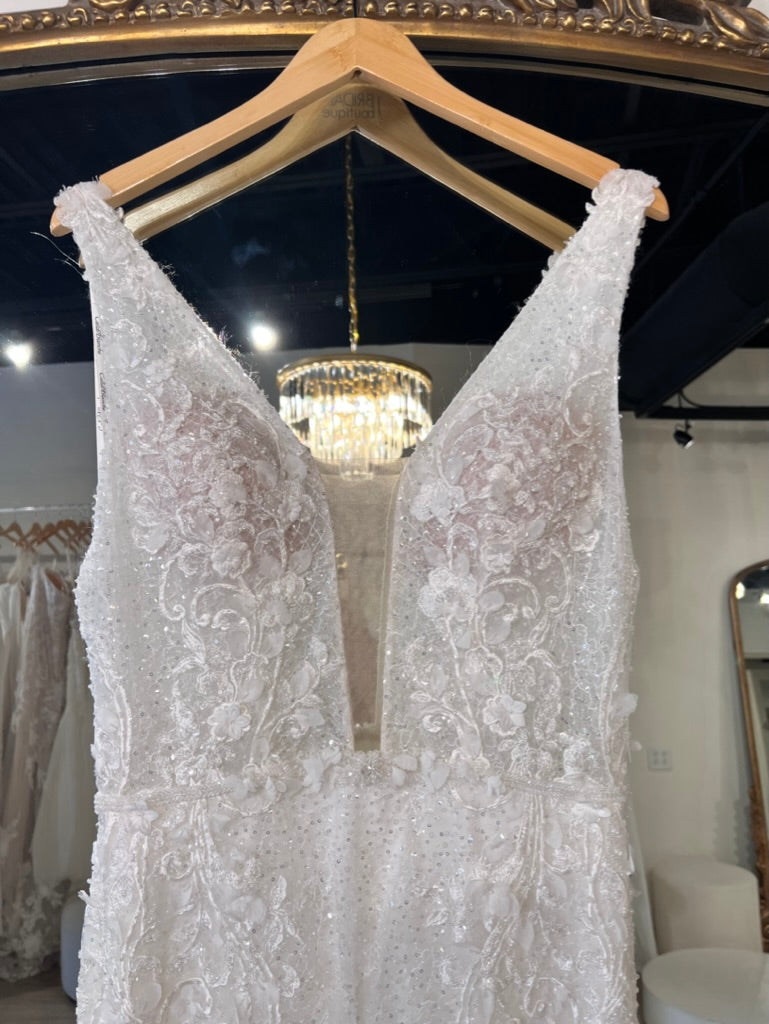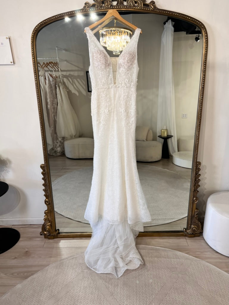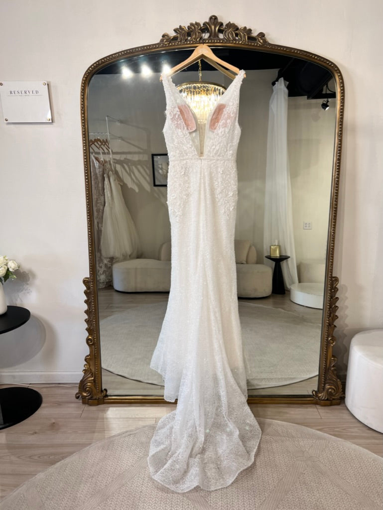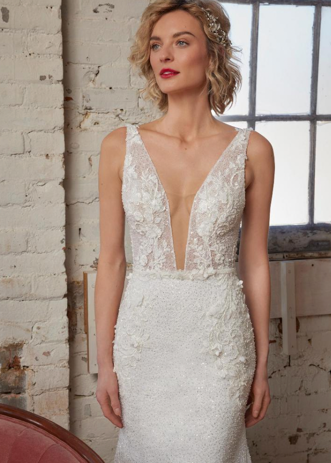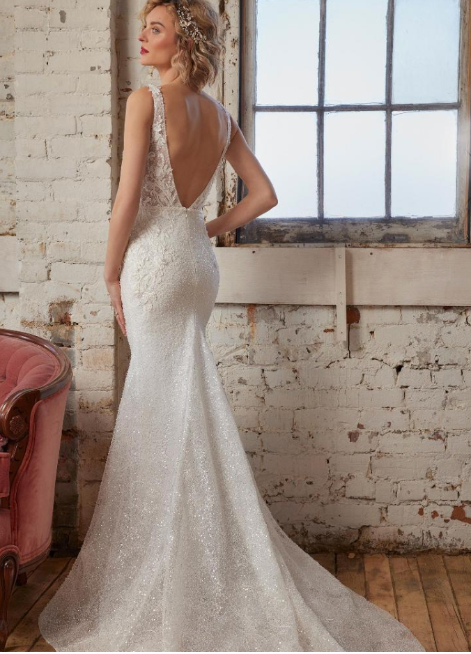 Backless sheath lace wedding dress with intricate beading and beautiful plunge neckline. She has shimmering details from top to bottom. Fitted Sexy Beaded Wedding Gown.