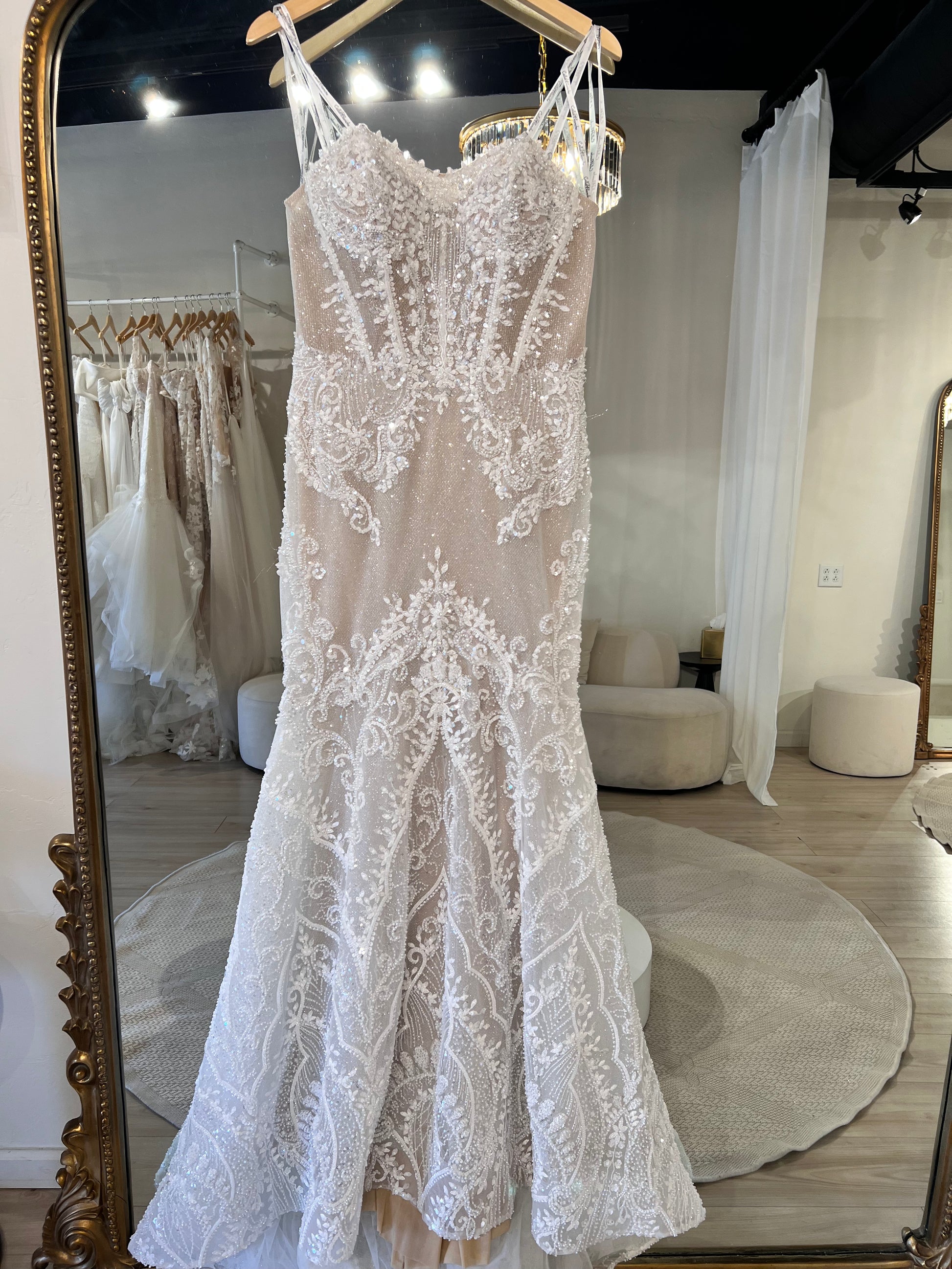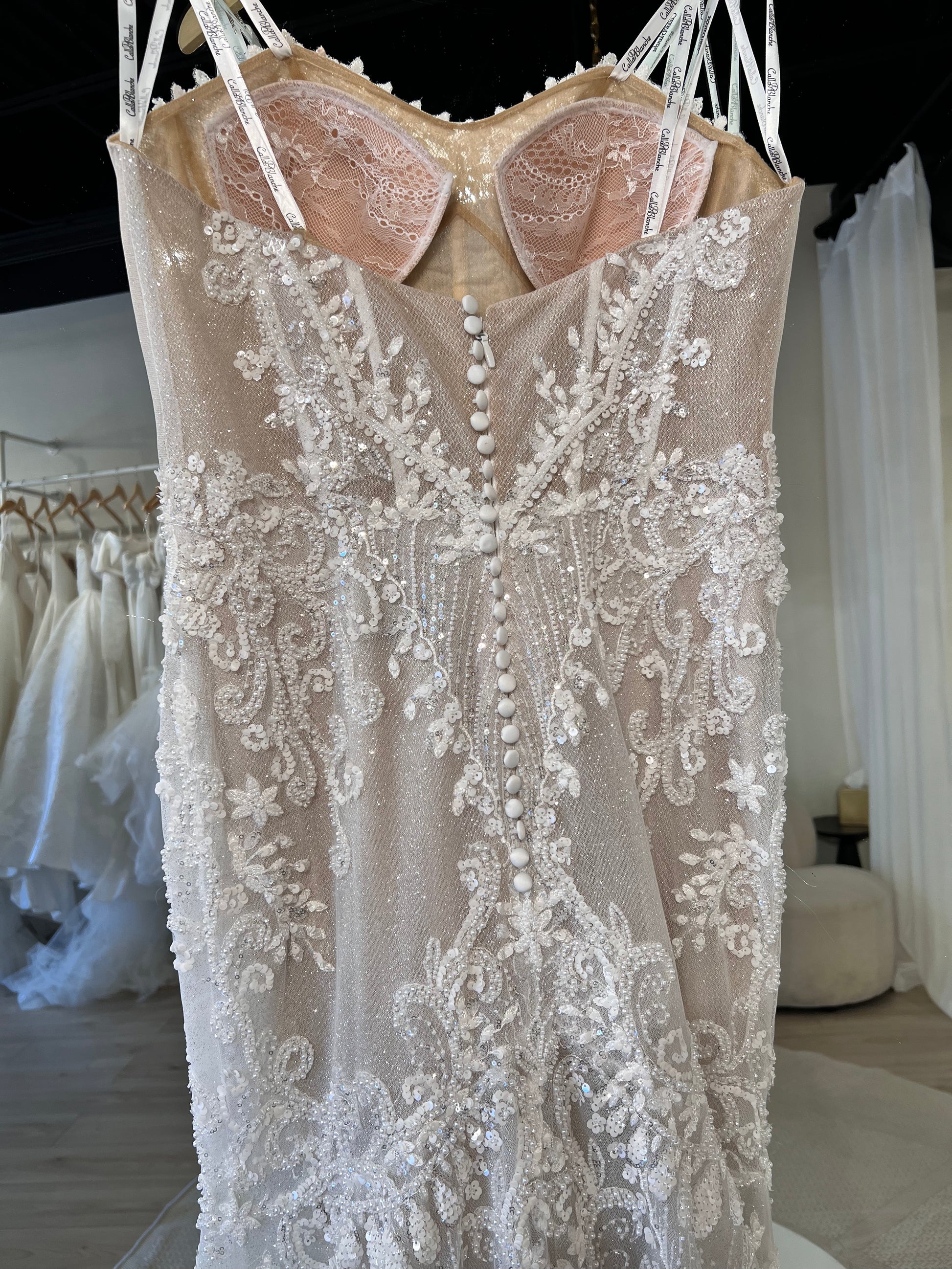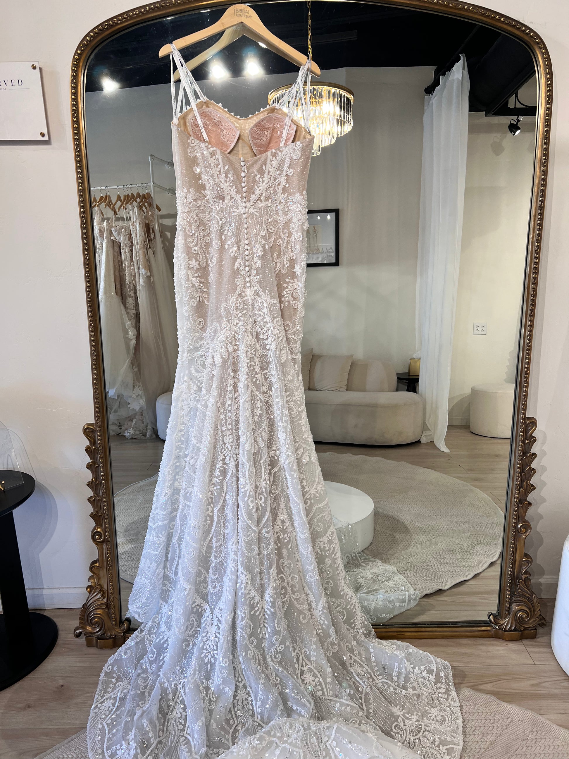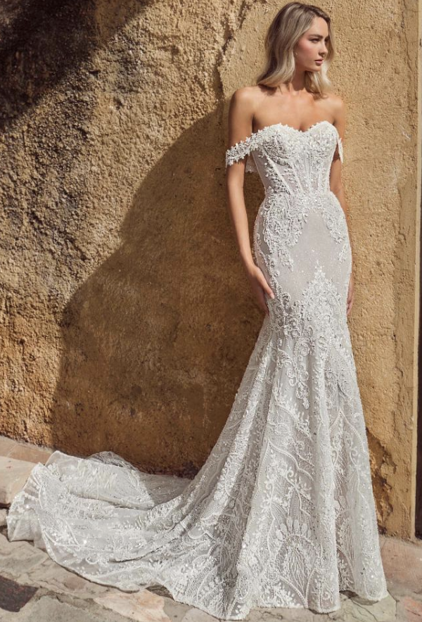 Vintage beaded lace mermaid dress with off shoulder straps and glitter tulle throughout.