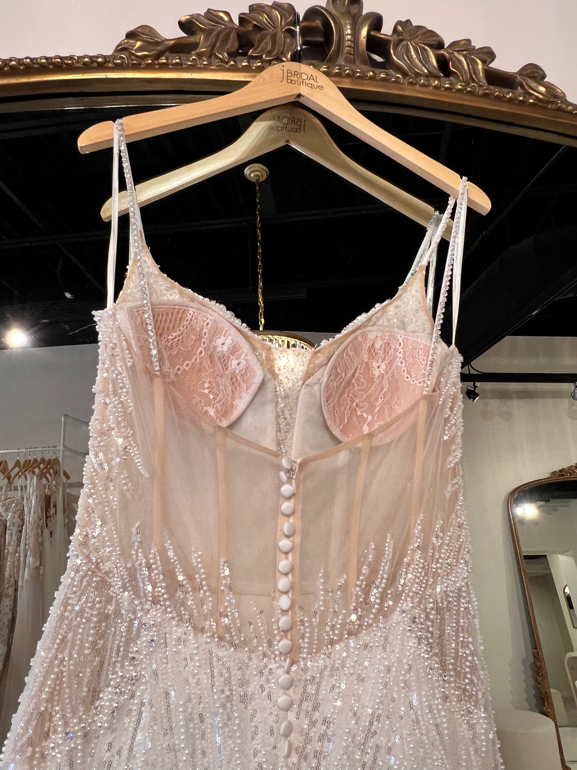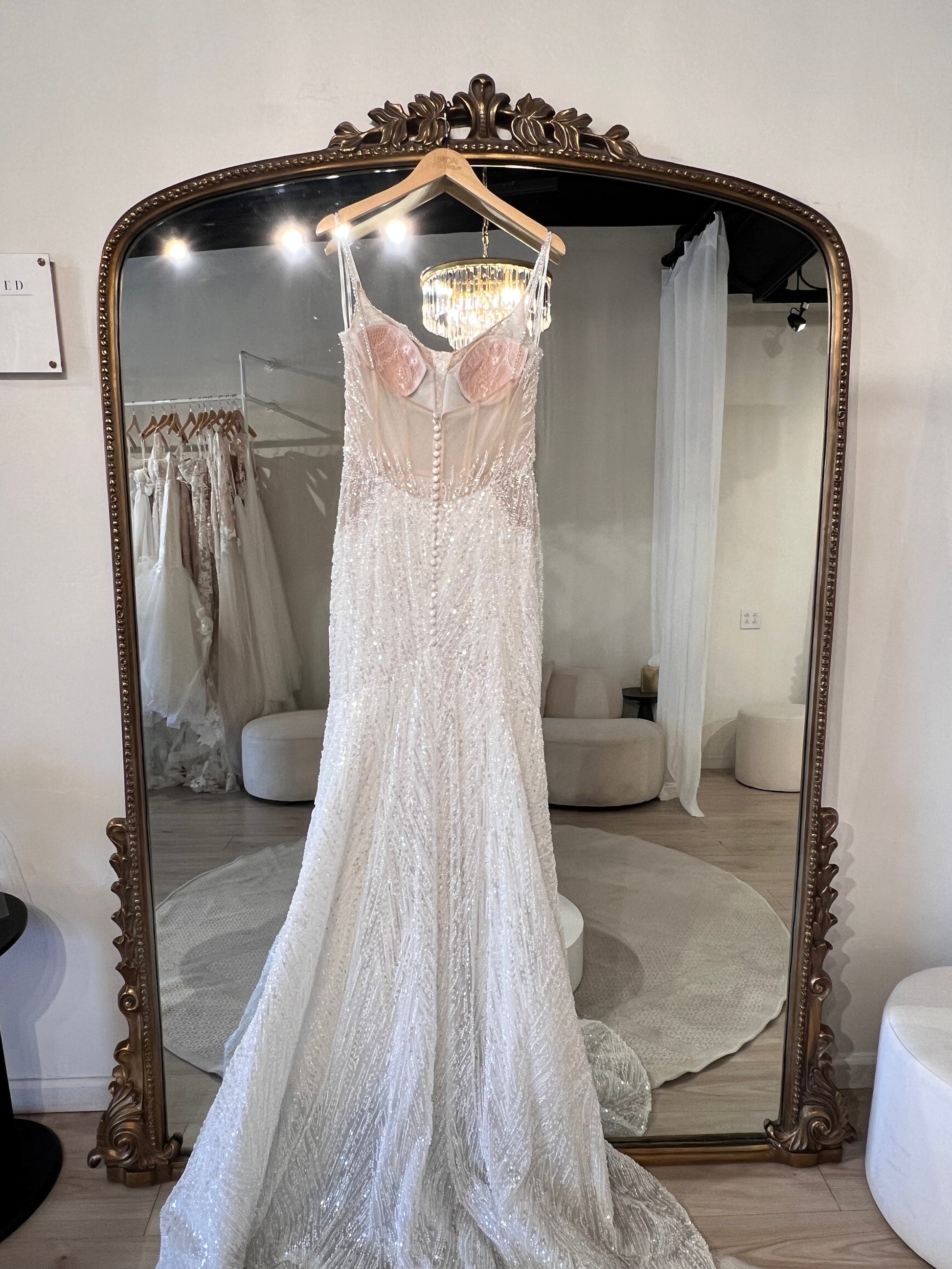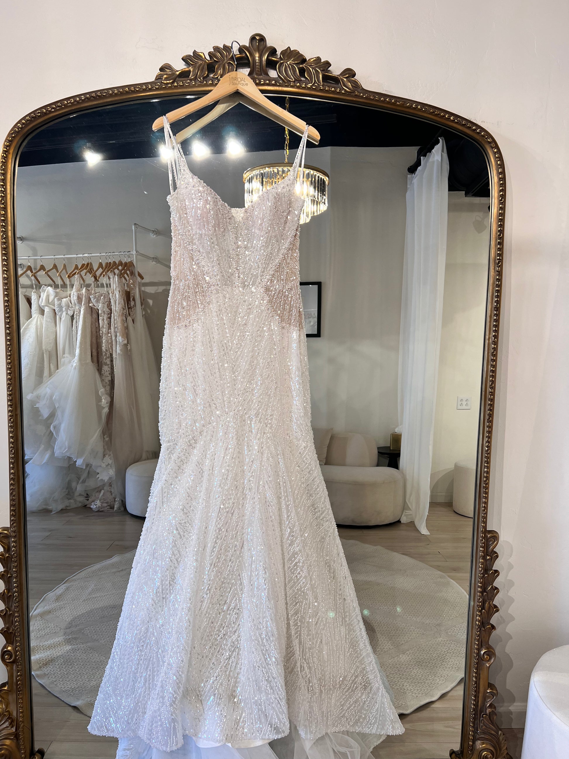 Fully beaded fit and flare gown with side illusion and beaded straps.